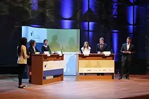 The format of the debate is strictly set up: Four students, two on the pro side, two on the contra side, debate for 24 minutes in German language on socio-political issues (e.g., "Should Turkey accede to the European Union?"). The debate starts with an opening round in which every participant has two minutes to outline his or her position. In the following twelve minutes the four debaters can exchange their arguments without strict regulations. During the final round the participants have one minute each to reflect on the arguments and summarize their final position in the light of the debate. A jury of three evaluates the debate according to the following points: expertise, eloquence, conversational competence and persuasiveness. Language skills are not included in the assessment.[4]
