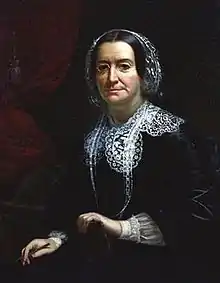 Shortly before the school opened, Tevis gave birth to her first child. As she would with its six siblings, she continued working and simultaneously raising her family.[14] A cholera epidemic in the 1830s nearly forced the closure of the school, but Tevis persevered and built the student body from its initial thirty-five pupils to 250 by 1857.[7][13] Her husband John, had a stroke in 1857 and thereafter suffered from ill-health. He died on January 26, 1861, just prior to the beginning of the Civil War.[13][15] Around the same time as her husband's death, Tevis' likeness was featured in the Nashville-based Home Circle newspaper's February 1861 issue.[16] It is unknown if the engraving published in the Home Circle was taken from the portraits painted of the Tevises by Charles Bond, probably in 1860.[17]