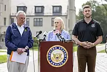 On August 1, following the flooding, the United States Department of Agriculture designated seven counties in Massachusetts as disaster areas.[108] Also on August 1, the Tennessee Emergency Management Agency deployed two personnel to Vermont to aid in the aftermath of the flooding in Vermont.[109] The day after, Massachusetts governor Healey signed a supplemental budget of $20 million to aid in Massachusetts farms which were impacted by the flooding.[110] On August 3, U.S. senator Ed Markey visited flooded areas in Conway, Massachusetts, and announced a climate bill.[111]
