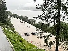 Flooding occurred at the United States Military Academy, inundating vehicles and forcing drivers to swim out of them. Multiple water rescues, mudslides, and flooded roads prompted the town of Cornwall to issue a No Travel Advisory.[9] Portions of U.S. Route 9W and Palisades Interstate Parkway were washed out or collapsed and closed.[10] Portions of New York State Route 218 were totally washed away by the floods.[11] Areas near the Hudson River and in the Hudson Valley were flooded as a rare flash flood emergency was issued.[12] A New York City-bound Amtrak train was stopped at Poughkeepsie due to reports of the train tracks south of Poughkeepsie being washed out, cutting off access to New York City, and was reversed and rerouted back to Rhinecliff.[13] Amtrak Service was also suspended between New York City and Albany,[14] as well as service from New York City to Burlington, Vermont also being suspended.[15] In Saratoga County, U.S. Route 4 and New York State Route 32 were flooded with 2 ft (61 cm) of rainfall.[13] Train service on Metro-North Railroad Hudson Line were stopped between Croton–Harmon and Poughkeepsie because of downed trees and damaged tracks.[16] Due to the heavy rainfall, New York governor Kathy Hochul issued a state of emergency for Orange County, where 8 in (200 mm) of rain fell on Highland Falls and West Point in the eastern corner of the county.[17] Significant flooding also occurred in Stony Point, where water rescues occurred and several homes and a park were flooded.[18] Highland Falls also experienced significant flooding, with numerous streets in Highland Falls flooded and access to Highland Falls from Interstate 87 and U.S. Route 6 were closed due to flooding.[19] Newburgh–Beacon Ferry Service was unavailable on July 10. CSX Tracks were compromised in 10 locations, with washed-out tracks between Selkirk and New Jersey.[20] Roads were washed out in Carmel as well.[20]