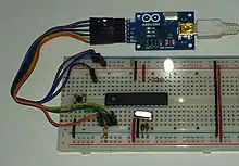 Jump wires at the end of a multi-colored ribbon cable are used to connect the pin header at the left side of a blue USB2Serial board to a white breadboard below. Another jumper cable ending in a USB micro male connector mates to the right side of the USB2Serial board. Red and black tinned jump wires can be seen on the breadboard.