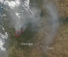 ![]() MODIS/NASA satellite image of the fires of Castanheira de Pera and Pedrógão Grande and associated smoke plumes drifting into Northern Portugal and Spain on 18 June | |