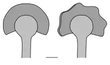 In the flattened fossils, the sporangia consist of a central, roughly circular area, on average 2 mm in diameter, smoothly connected to the end of the stem on which they were borne. Around the top and sides of the central area there is a border, around 1 mm wide, which is not connected to the stem and ends abruptly. The border varies in shape, sometimes being uniform, sometimes lobed; it appears to consist of two layers separated by a 'filling'. The layers appear separated into two 'valves' in some specimens. Cai et al. say that it is difficult to reconstruct the three-dimensional structure of a sporangium before preservation; it may have been more-or-less spherical or it may already have been compressed from side to side before being fossilized. They concluded that "[t]hese unique and somewhat bizarre sporangia ... defy our understanding", but that the most surprising feature was their complexity relative to other Silurian species such as Salopella, Cooksonia or Steganotheca.[1]