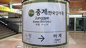 Junggye Station is a station on the Seoul Subway Line 7. Its name comes from Junggye-dong, where it is located, and means "in the middle of Hancheon".[1][2][3][4]