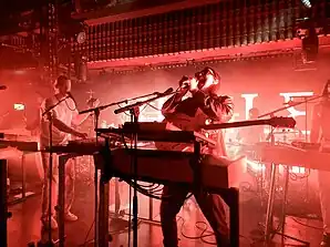 Jungle were founded in 2013 by Josh Lloyd-Watson and Tom McFarland, who had been friends since they were nine years old and lived next door to each other in Shepherd's Bush, London.[2] Originally the pair were part of the short-lived indie band Born Blonde, which released one album in 2012.[3] They went on to form Jungle at the beginning of 2013, choosing to put an aesthetic emphasis on the music's surrounding artwork and videos, and not on the pair's own identity. Initially hiding their names and faces, Josh Lloyd-Watson and Tom McFarland came to be known as J and T.[4][5] Over the course of the following year, Jungle evolved into a collective by working with different artists across diverse disciplines. To perform the music live, Jungle expanded to a seven-piece band, fronted by J and T. The pair wished to challenge themselves, resisting the temptation to simply re-produce their music from their laptops, and instead translated their songs into a full and organic live experience. J and T have explained that Jungle stemmed from a desire for 'honesty… true connection and friendship. It's about being in a collective and collective energy… [a] team spirit.'[6]
