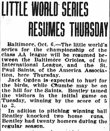 The Junior World Series was a postseason championship series between champions of two of the three highest minor league baseball leagues modeled on the World Series of Major League Baseball. It was called the Little World Series (no relation to the Little League World Series) until 1932, and acquired other official names at different times.