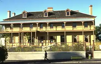 The area developed after a road was constructed to link up with a pilot station that was to be built at Watsons Bay on South Head Road. John Palmer, the settlement's commissary, refused to allow people to cross his land grant at Woolloomooloo, so the road had to follow a roundabout way through Paddington to bypass his 40 hectares (100 acres).[1] Only a handful of workers lived in the area, and it was not until 1838, when it was decided to build a new military barracks in Paddington, that life came to the area.[1] From 1848 when Victoria Barracks had been opened (designed by Lt.-Col.George Barney) and homes for the soldiers and their families had been erected, Paddington began to assume a real identity. The barracks site land was sandy - in fact a huge sandhill was located on the western side of the Greens Road area, and the foundation trenches had to be dug very deep, to locate firm stone for the foundations. Stone was mostly quarried in the area: the stonemasons were free settlers who had worked on erection of the Customs House at what was then Semi-Circular Quay.[1] Once the soldieis and their families moved here, shopkeepers followed. Builders moved into the area and put up 3,800 houses between 1860 and 1890. These terraces give today's Paddington its air of individuality. The first school in the area was opened in the Presbyterian manse in Oxford Street, built in 1845.[1]