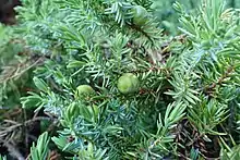 The seed cones are berry-like, green ripening in 18 months to purple-brown; they are spherical, 8–9 mm diameter, and have three or six fused scales in one or two whorls of three; the three larger scales each bear a single seed. The seeds are dispersed when birds eat the cones, digesting the fleshy scales and passing the hard seeds in their droppings. The pollen cones are yellow, 5 mm long.[3]