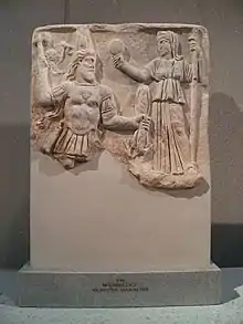 Of the 260 devotees named in votive inscriptions, 97 are for soldiers, and it thus seems that the cult had a particular attraction for members of the military. In CIL XIV, 110 from Ostia Antica, an inscription from around 186 AD, an entire naval unit – a detachment of the fleet at Misenum – is named as dedicator.[14] Several votive tablets include depictions of military standards and war trophies. Dedications to Jupiter Dolichenus by the commanders of provincial armies indicate there was a certain measure of support for the cult in high ranking army circles.[15] Also the inscription CIL XIII, 8201 suggests that the cult could attract important patrons.[1] That inscription of the provincial governor Lucius Lucceius Martinus (legatus Augustorum pro praetore provinciae Germaniae inferioris) commemorates the restoration of a temple dedicated to Jupiter Dolichenus in 211/212. However, it's not clear how involved such a dignitary might have been in the cult, or whether the governor was even an initiate. The dedication could merely represent the fulfillment of political duties. The inscription does however indicate a measure of support from influential persons.