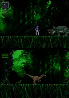 Jurassic Park is a standard side-scrolling action video game, with platform gameplay elements.[2] The end objective is to reach the end of each level, using items placed at fixed locations. However, the game features a then-uncommon variation in action games, giving players the option of using two characters that played independently to one another. The game is playable as either paleontologist Dr. Alan Grant, or a Velociraptor.[2] Grant is the default character and can be switched to the Raptor using the "Player" option on the game's main menu. The game has three selectable difficulty levels: "Medium" is the default neutral setting while "Hard" means more damage taken from enemies (who move faster and attack frequently) and "Easy" mode makes for less troublesome foes from which relatively little damage is taken.