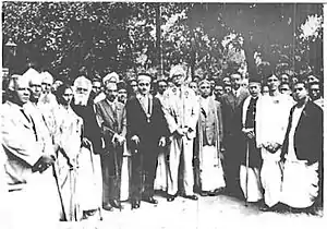 Under Periyar's leadership, the party embraced the secession of Dravidistan (or Dravida Nadu). At the 14th annual confederation (held in December 1938), Periyar became party leader and a resolution passed pressing Tamil people's right to a sovereign state, under the direct control of the Secretary of State for India.[46] In 1939, Periyar organised the Dravida Nadu Conference for the advocacy of a "separate, sovereign and federal republic of Dravida Nadu". Speaking on 17 December 1939, he raised the slogan "Dravida Nadu for Dravidians" replacing the "Tamil Nadu for Tamils" that had been used earlier (since 1938).[47] The demand for "Dravidistan" was repeated at the 15th annual confederation in August 1940.[48] On 10 August 1941, Periyar stopped the agitation for Dravida Nadu to help the government in its war efforts. When the Cripps Mission visited India, a Justice delegation, comprising Periyar, W. P. A. Soundarapandian Nadar, N. R. Samiappa Mudaliar and Muthiah Chettiar, met the mission on 30 March 1942 and demanded a separate Dravidian nation. Cripps responded that secession would be possible only through a legislative resolution or through a general referendum.[49][50] During this period, Periyar declined efforts in 1940 and in 1942 to bring Justice to power with Congress' support.[51]