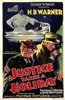 Justice Takes a Holiday is a 1933 American crime film directed by Spencer Gordon Bennet and written by John T. Neville. The film stars H. B. Warner, Patricia O'Brien, John Ince, Matty Kemp, Huntley Gordon, Audrey Ferris and Robert Frazer. The film was released on April 18, 1933, by Mayfair Pictures.[1][2][3]