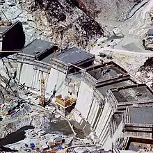 Notwithstanding these remedial actions, a long-term solution was required. This came in the form of a 70 m (230 ft) tall "thrust block" that had to be constructed at the downstream base of the dam in order to absorb load from the dam and pressure on its abutments. Its construction was approved in 1988 and executed between 1989 and 1992. Joining the dam and the block are over 600 special neoprene pads which adjust to forces from the reservoir rising and lowering. In addition, joints and fissures in the dam were re-grouted again but with a water-tight resin epoxy.[5][6][7] The reservoir was able to operate at maximum levels and operate as normal in 1993.[8]