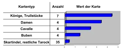 Königrufen uses the basic Tarock pack with a reduced number of cards – the full Tarock pack contains 78 cards. The 54-card pack is divided into two groups: 22 tarocks and 32 suit cards.[22]