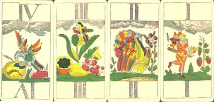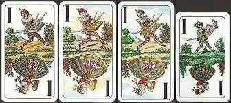 Six tarocks play a special role and are thus given names. Cards I to IIII are commonly called Birds (Vogerl or Vögel):[65][66]