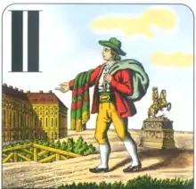 The oldest bird is the Tarock I, the Pagat. Its role in the last trick is clearly older than Königrufen itself. It was first attested in Italy during the 16th century.[35] It has been known as bagatto ultimo in Piedmont since the 18th century. At that time Milan belonged to the Habsburg monarchy, and in this way the bonus and the term came to Austria. There it was further introduced that the Pagat ultimo can also be declared beforehand, very probably taken from a similar announcement in Hundertspiel, an Austrian version of the originally Italian card game, Trappola.[36] The Pagat ultimo became a characteristic feature of almost all Tarock variants in the Habsburg Empire.[34]