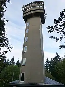 On the summit region of the Köppel in the parish of Dernbach is the Köppel viewing tower which was built from 1964 to 1966[4] from reinforced concrete and which is 37.48 m[4] high. It has a covered viewing platform 28.8 metres above the ground[5] offering views over the Westerwald and the volcanoes in the Pellenz and as far as the Eifel, Taunus and Hunsrück. It has transmitters for the D2 mobile network. In the vicinity of the tower is a restaurant.