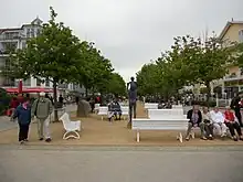 The remodelling of the pier forecourt was carried out in phases. The Kopfsituation, with its Forum and Bastion, was built in 1992. The forecourt was designed in 1991. The running area (Laufachse) and ramps, the pavements and the play area (Spielachse) were added in 1995. On the forecourt the protected sculpture Vater und Sohn ("Father and Son"), sculpted in the 1970s by Reinhard Schmidt, has been erected.