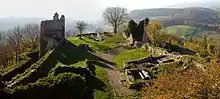 The hill castle is one of the most important historic buildings on the High Rhine and a landmark of the county of Waldshut. It was probably constructed between 1125 and 1141. The present ruins were owned inter alia by the counts of Küssenberg, the Bishopric of Constance and the counts of Sulz. The castle, which was later developed into a fortress, was destroyed by a fire started by its garrison on 8 March 1634 when the Swedish Army approached it during the Thirty Years' War and by a landslide on 25  December 1664. In the 19th century work began on uncovering the ruins which have since become a popular destination in the region.[1]