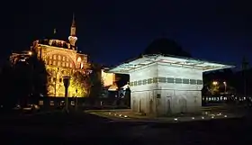 To the right of the mosque is the hamam, completed in 1583.[2] The glass doors lead into two separate soğukluks (cool rooms) on either side of the hararet (caldarium - hot room) which is hexagonal in plan with open bathing places in four of its six arched recesses, the other two opening on to the soğukluks. The placement of the soğukluks and the plan of the hararet differ from the usual layout used by Sinan in other surviving hamams.[3]