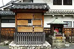A kōsatsu (Japanese: 高札, literally "High plaque"), also called Seisatu (Japanese: 制札, literally "Controlling plaque"), was a public notice of the han-lord's or shogun's proclamations earlier in Japanese history.[1] They were local or nationwide laws written on a wooden plate, placed in the kōsatsu-ba of the shukuba or sekisho (関所), the border between han, where there was frequent traffic.