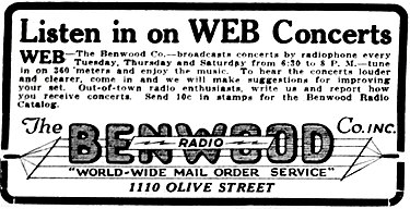 WEB was the fourth St. Louis radio station to receive a broadcasting license, preceded by the St. Louis Post-Dispatch's KSD (March 14, 1922, now KTRS), St. Louis University's WEW (March 23, 1922), and the Stix-Baer-Fuller department store's WCK (April 3, 1922, deleted November 30, 1928, as WSBF). At this time all broadcasters transmitted their entertainment programs on 360 meters, so the stations in a given area had to establish a time-sharing agreement specifying the time periods during which each would operate. A Benwood Company advertisement that appeared in early May listed WEB's schedule as 6:30 to 8:00 p.m. on Tuesday, Thursday and Saturday evenings.[14] In late April it was announced that WEB had installed a 300-watt transmitter — a high power for the time — consisting of six 50-watt tubes.[15]