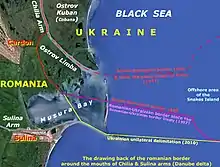 The K or Nova Zemlya Island (Romanian: Insula K, Ukrainian: Острів Нова Земля), sometimes referred to as the Island of Happiness (Romanian: Insula Fericirii), is a newly formed and uninhabited island in the Musura Bay where the Danube Delta meets the Black Sea. The island is disputed and is currently divided between Romania (40%) and Ukraine (60%).[1][2]