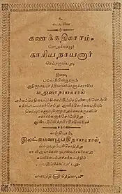 Kaṇakkatikāram was popular in Kerala also and it had been in wide use as a textbook for teaching arithmetic to children in the elementary schools in Kerala during the pre-Independence era.[2] A Malayalam adaptation of work with some additional mathematical material and explanations, authored by Mavanan Mappila Seyd Muhammed Asan, was printed and published by CMS Press Kottayam in 1863. The title of the Malayalam version of the book is Kaṇakkadhikāram.[3]