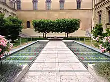 In the mid-19th century, the courtyard was built on the eastern edge of the residence, which was surrounded by a wall and could only be entered through a narrow opening. Originally a fountain stood in the middle of the lawn, which was bordered by four linden trees along the courtyard wall and a wooden pergola. In the 20th century, the garden became overgrown and was used as a vegetable garden or as a chicken farm.[1]