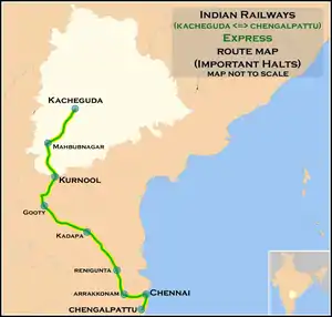 The 17652 / 51 Kacheguda–Chengalpattu Jn Express runs from Kacheguda via Gooty, Cuddapah, Renigunta Junction, Arakkonam Junction,Chennai Egmore , Tambaram to Chengalpattu Jn.