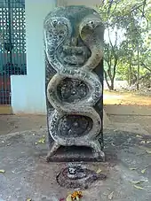 On another occasion, Kadru suggested to Vinata that Vinata should take Kadru, and that Garuda should take her naga sons, to the beautiful island of Ramaniyaka in the middle of the ocean[3] within the abode of snakes.[9] Vinata and Garuda did as directed. After reaching the destination Kadru asked Garuda to take her sons to the abode of the sun to pay their respectful obeisance. Garuda carried the naga sons of Kadru on his back and approached the sun. As he flew closer, the nagas could not withstand the heat and started falling off him to the ground in a faint, on the island of Virana. Hearing the cries of her children, Kadru was deeply distressed and blamed Garuda for what had happened to her children. Vinata, distressed by her son's plight and, following a suggestion by Kadru, asked Garuda to bring water of the Ganga from the netherworld. Garuda obeyed and brought the water to the southern bank of the Gautami river and sprinkled it on the snakes, which then revived. The place where this incident occurred is called Nagalaya, the abode of the snakes.[9] In another version of the story related in the Adi Parva of the Valmiki Ramayana, it is said that when the nagas fainted and fell to the ground due to intense heat of the sun, Kadru offered prayers to Indra to come to her children's rescue. Indra promptly created rain showers to fall on the nagas and they were restored from their charred state. They then lived in the island of Ramaniyaka.[3]