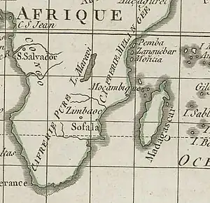 Detail of a 1795 French map distinguishing between "Pure-Blood Cafreria" (Cafrerie Pure) in Southern Africa and "Mixed-Blood Cafreria" (Cafrerie Melangée) inland from the Swahili Coast.