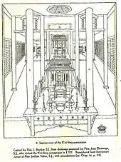 Outside the synagogue was a large hall, the Tz'u t'ang (祖堂:zǔ táng) or "Hall of the Ancestors" where, according to the Portuguese Jesuit Jean-Paul Gozani (1647–1732) who lived in Kaifeng from 1698 to 1718, incense bowls were placed to commemorate the patriarchs and outstanding figures of the Law, as well as various holy men (聖人:shèngrén). This was similar to Chinese rites regarding ancestors, with the difference that no images were allowed.[67][68] Their Pentateuch was divided into 53 sections according to the Persian style.[69]