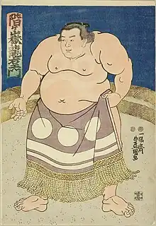 Although, he was never promoted quickly and struggled at the bottom of the division for five years years, before being promoted to komusubi in 1853, he showed great abilities by defeating seasoned wrestlers such as Koyanagi and Inagawa.[3] In the second tournament of 1853, however, he lost the Hachinohe patronage and was recruited by the Morioka Domain. In 1856 he was promoted to the highest rank in sumo at that time, ōzeki. However, he fought only two tournaments at this rank before being demoted to sekiwake, ending his career at the top of the san'yaku ranks without ever managing to be promoted again.