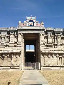 A granite wall surrounds the temple, enclosing all its shrines. The temple has a flat gateway tower, unlike other South Indian temples that have a pyramidal entrance tower. The temple was originally built by Chandrakula Pandya Vijayanagar and Nayak kings commissioned pillared halls and major shrines of the temple during the 16th century. The temple has artistic sculptures representative of Nayak art.