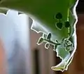 Propagation is by seed,[17] stem cuttings, or by leaf cuttings, in which the mid rib should be cut in various places. The cuttings should be grown on a sandy substrate.[18] In many instances, numerous varieties of Kalanchoe will not only root from freshly pruned leaves, they will form new baby plantlets right from the very center of the removed leaf.