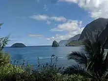 The Kalaupapa Peninsula remains one of the most remote locations in Hawaii due to unique volcanic and geologic activity over millions of years.[12] Specifically, Molokai’s famous sea cliffs, which reach up to three thousand feet above sea level and are among the tallest in the world, are most responsible for restricting access. Geologists thought that these cliffs were carved by wind and water erosion, but it is now believed that they formed after a third of the northern portion of the island collapsed into the sea. The offshore islands—'Ōkala, Mōkapu, and Huelo—support this theory, housing original plant species found on Molokai over two thousand years ago such as the rare native loulu palm.[12] Mōkapu also hosts a remnant population of Emoia impar, the dark-bellied copper-striped skink, which was introduced to Hawaii more recently.