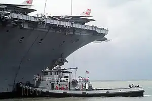 ![]() Kalispell (YTB-784) pushes against the bow of the aircraft carrier USS Ranger (CV-61) as she guides the carrier into her berth. | |