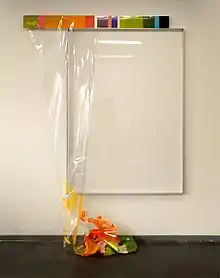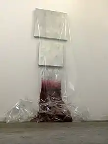 Kaloust Guedel's work explores contemporary issues often taking a critical stand on various societies shortcomings. Throughout the years, it has explored subjects as genocide, war, abuse and others.[8] Regardless of the styles and technics he has employed, his work has been consistent with contemporary sensibility and has reflected the consciousness of its time. Guedel is the first artist who used vinyl as a medium in paintings. He has been featured in publications like Masters of Today and has been known to explore capitalism and excess in his minimalist conceptual artworks.[9]