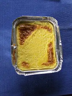 A related dessert is råmjölkspannkaka (raw-milk pancake).[2] Similar desserts like kalvdans exists in other countries. In Iceland, a pudding called ábrystir is made out of colostrum milk. A similar Finnish version is called uunijuusto (oven cheese). In England colostrum milk, or beestings as it is called locally, was traditionally used for puddings. In India kharvas is a dessert made out of colostrum milk from buffaloes.[6] In Norwegian and Danish dialects, the word kalvedans sometimes refers to a type of jelly made by veal meat.[3][8]