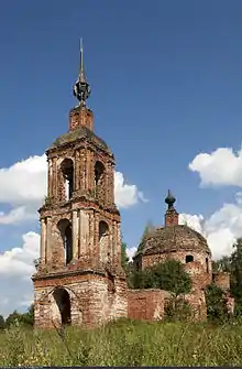 The district contains twenty-eight cultural heritage monuments of federal significance (sixteen of them located in Kalyazin) and additionally forty-two objects classified as cultural and historical heritage of local significance (twenty-two of them in Kalyazin). The district landmark is the Kalyazin Bell Tower, submerged by the Uglich Reservoir and located only partially above the water level. Other federal monuments include the ensemble of administrative buildings and living houses in the center of Kalyazin, the Ascencion and the Epiphany Churches in Kalyazin, the Epiphany Church in the village of Semendyayevo, and the estates of Kalabriyevo and Rylovo, as well as an archeological site.[16]