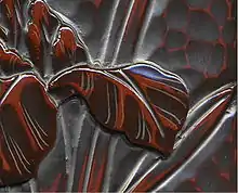 Kamakura-bori (鎌倉彫) is a form of lacquerware from Kamakura, Japan. It is made by carving patterns in wood, then lacquering it with layers of color. It is then polished.
