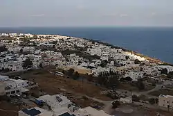 Kamari (Greek: Καμάρι) is a coastal village on the southeastern part of the Aegean island of Santorini, Greece, in the Cyclades archipelago with a population of approx. 1800 according to the 2001 census. It is part of the Municipality of Thira and is situated approximately 8 km away from the island's capital Fira. Kamari was built by residents of the nearby village of Episkopi Gonias, which was almost flattened by a devastating earthquake that hit Santorini in July 1956.