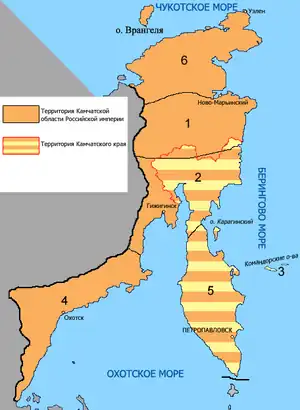 By the law of June 30, 1909, the Kamchatka Oblast was created for the third time. The Oblast included Petropavlovsk, Okhotsk, Gizhiginsky, Anadyr Uyezds and the Commander Islands, separated from the Primorskaya Oblast. At the same time, in the territory of Chukotka (part of the Anadyr Uyezd) the Chukotka Uyezd was formed. In 1922, the Kamchatka Oblast was transformed into the Kamchatka Governorate.[1]