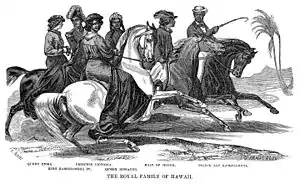 Wyllie sponsored a fancy dress ball in 1860. Even the Catholic bishop came, dressed as a bishop. Kamehameha IV's father Kekūanaōʻa came in Scottish highland dress, music was provided by German musicians, and the food by a French chef. Emma came as the earth goddess Cybele. The conservative American missionaries did not approve, especially of the dancing.[11]