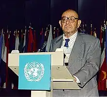 ![]() Kamel Maghur speaking at a United Nations conference in Rome. | |