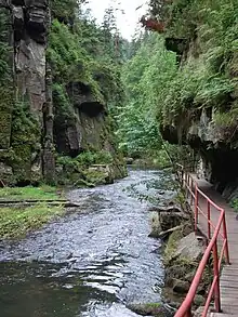 The Kamenice Gorge (formerly known as Kamnitz Gorge; Czech: Soutěsky Kamenice, German: Kamnitzklamm) is a rocky ravine between Hřensko, Mezná and Srbská Kamenice in Bohemian Switzerland in the Czech Republic. The river Kamenice flows through it and discharges near Hřensko into the Elbe.