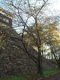 In 1636, Honda Toshitsugu received permission to build a yagura on the raised base of the former tenshu. Named the "Tamon-yagura", this is one of the few surviving structures of the castle and was declared a historic site by the prefectural government in 1953.[2] In 1873, as per government decrees following the Meiji Restoration, most of the remaining castle structures were demolished.[3] One survivor is the entrance to the Ni-no-maru daimyō residence, which is incorporated into the main hall of the temple of Tensho-ji in the Nishimachi neighborhood of Kameyama.