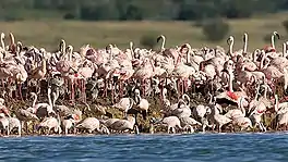 ![]() Lesser flamingos on Kamfers Dam's artificial breeding island, 2008 | |