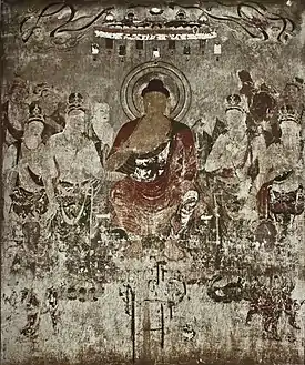 East panel of the north wall of the Hōryū-ji Kondō, showing the eastern paradise of Yakushi Nyorai; a number of mural fragments from Kamiyodo Haiji have been located in a similar scheme in reconstruction drawings, identified as parts of a canopy, flanking tennin's robe, nimbus, seated Buddha's robe, dais, heavenly general, bodhisattva, and lotus pedestal[3]